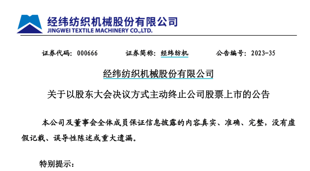 兄弟姐妹们啊,又见证历史了,A股上市公司经纬纺机8月29日深夜突然发公告,宣布退市。