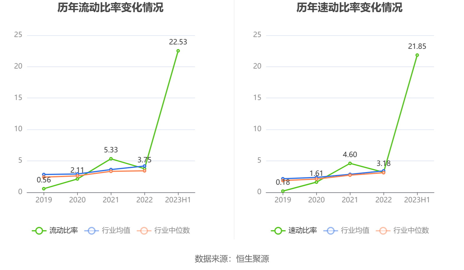 2023年上半年,公司流动比率为22.53,速动比率为21.85。