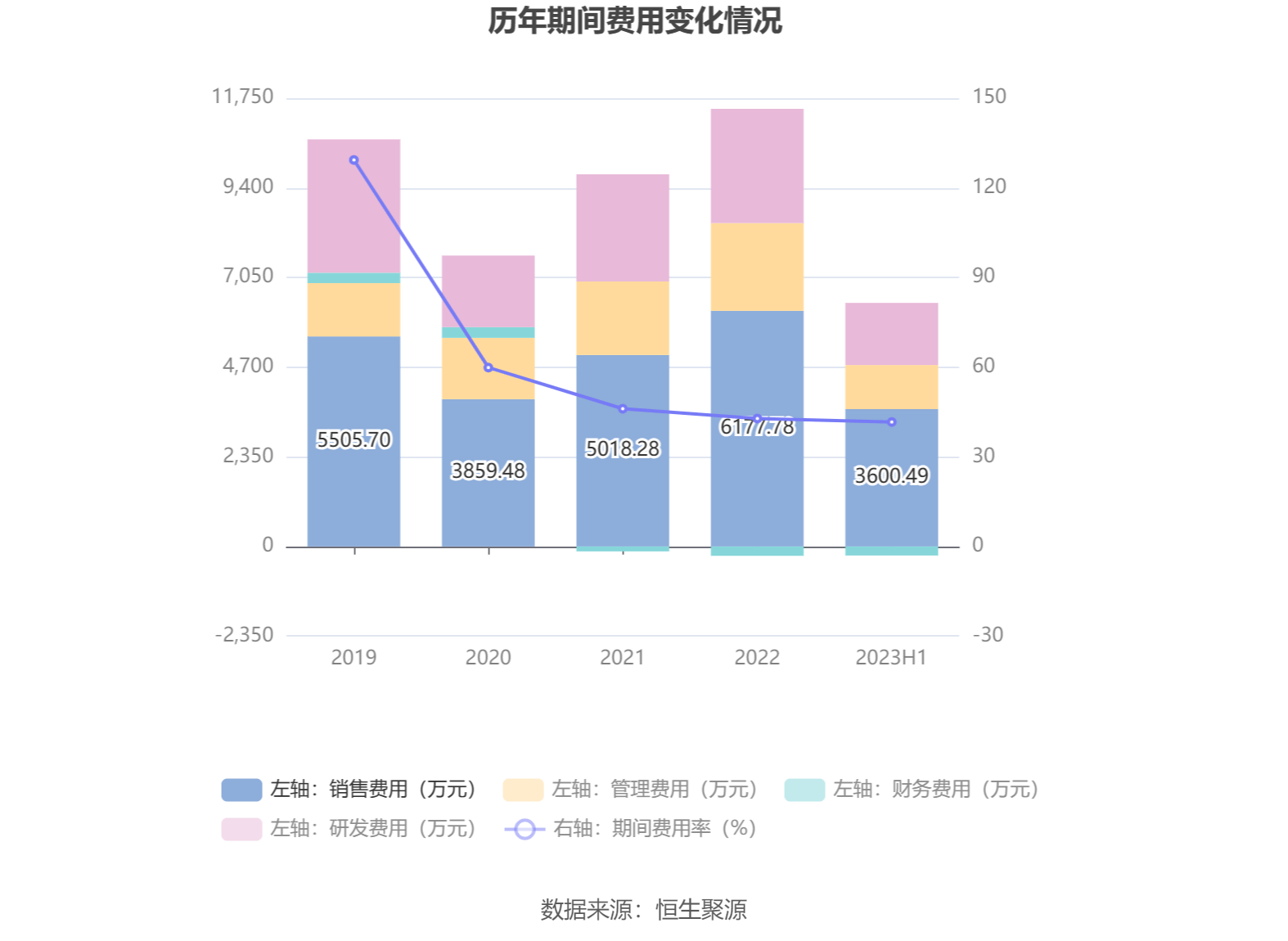 2023年上半年,公司期间费用为6148.07万元,较上年同期增加1808.71万元;期间费用率为41.66%,较上年同期上升2.77个百分点。其中,销售费用同比增长62.91%,管理费用同比增长6.91%,研发费用同比增长35.43%,财务费用由去年同期的-153.96万元变为-236.26万元。