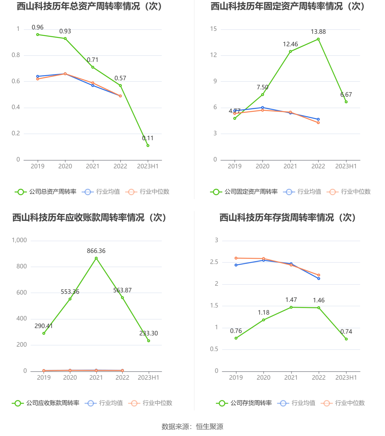 营运能力方面,2023年上半年,公司总资产周转率为0.11次,上年同期为0.27次(2022年上半年行业平均值为0.25次,公司位居同行业18/42);固定资产周转率为6.67次,上年同期为6.14次(2022年上半年行业平均值为2.06次,公司位居同行业6/42);公司应收账款周转率、存货周转率分别为233.30次、0.74次。