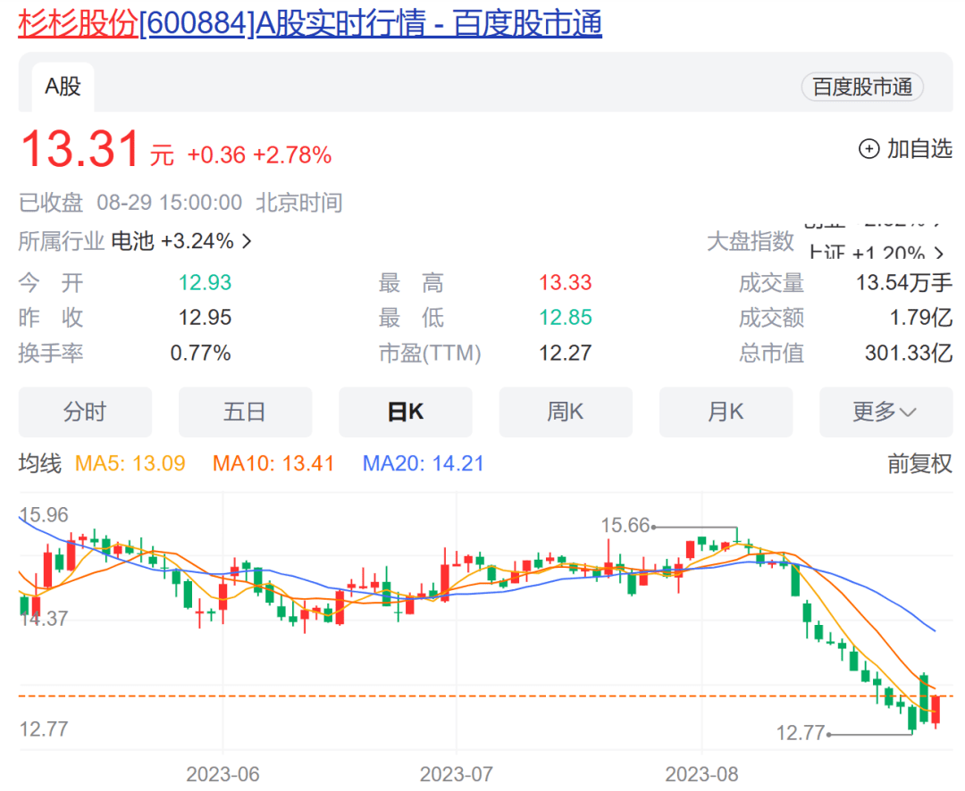 值得注意的是,在前段时间大盘低迷之下,杉杉股份的股价遭遇一波下滑,12个交易日下滑超15%。8月29日,杉杉股份上涨2.78%,报收13.31元/股。