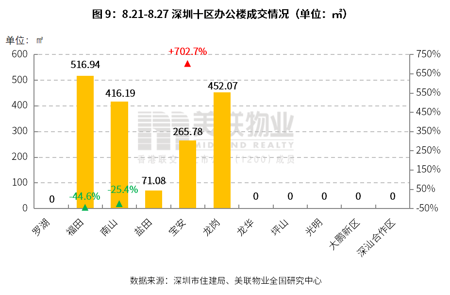 分区域来看,上周一手办公仅福田、南山、盐田、宝安和龙岗5区有备案,其中宝安区备案量环比涨幅最高,环比上涨702.7%,共计备案265.78㎡。备案量最高的福田区,共计备案516.94㎡。