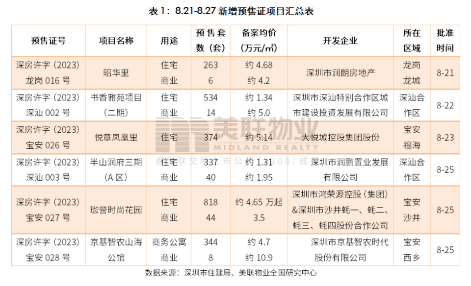 上周(8.21-8.27)深圳新房市场共计6个项目合计2782套商品房取得预售许可证,龙岗1个、宝安3个、深汕合作区2个。其中,5个项目含住宅产品,共计2326套住宅产品取得预售许可证。此前宝安区开盘热销的珈誉时尚花园再有818套住宅产品取得预售许可证,备案均价约4.65万元/㎡起,后续开盘值得期待。