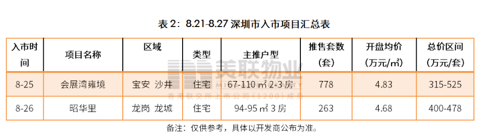上周(8.21-8.27)深圳新房市场迎来2个项目开盘入市销售,分别是宝安沙井的会展湾雍境和龙岗龙城的昭华里。会展湾雍境共计推出778套 67-110㎡2-3房住宅产品,开盘均价约4.83万元/㎡,与此前3月份一期开盘去化高达7成比,此次开盘冷清不少,仅145批客户成功意向登记,具体开盘结果未公布;昭华里共计推出263套94-95㎡3房住宅产品,开盘均价约4.68万元/㎡,亦未公布开盘结果。
