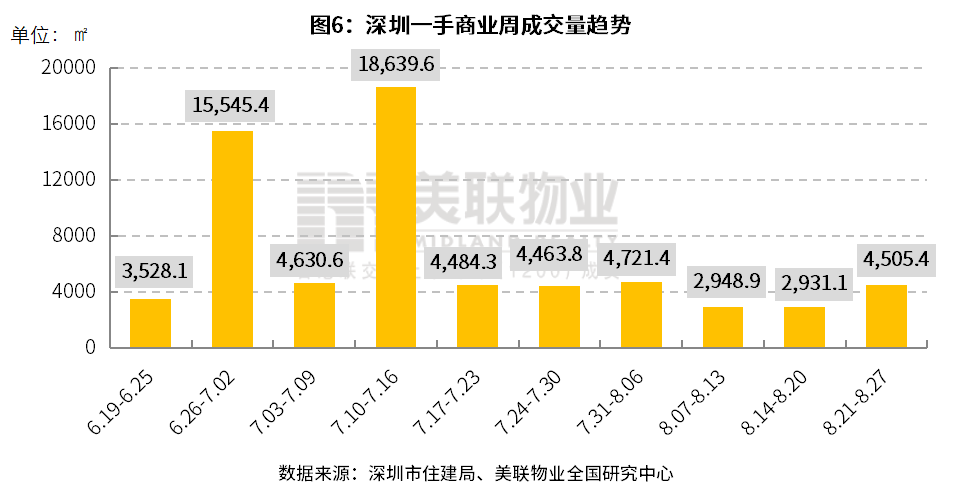 上周(8.21-8.27)全市一手商业备案量环比上涨,共计备案64套,总备案面积4505.44㎡,环比上涨53.7%。