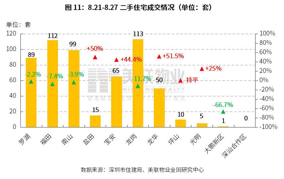 分区域来看,上周二手住宅备案量盐田、宝安、龙华和光明4区环比上涨,其中涨幅最高的为龙华区,环比上涨51.5%;坪山区备案量环比持平、深汕合作区无备案;剩下的罗湖、福田、南山、龙岗和大鹏新区备案量环比下跌,跌幅最高的为大鹏新区,环比下跌66.7%。