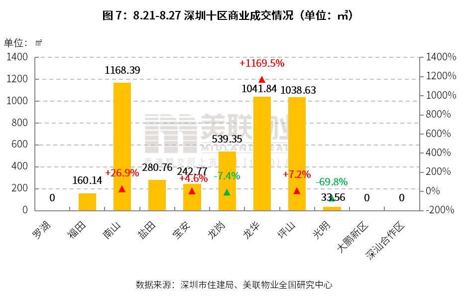 分区域来看,上周一手商业龙华区备案量环比涨幅最高,高达1169.5%,共计备案1041.84㎡;光明区备案量环比跌幅最高,共计备案33.56㎡,环比下跌69.8%。从备案量来看,则南山区最高,共计备案1168.39㎡。