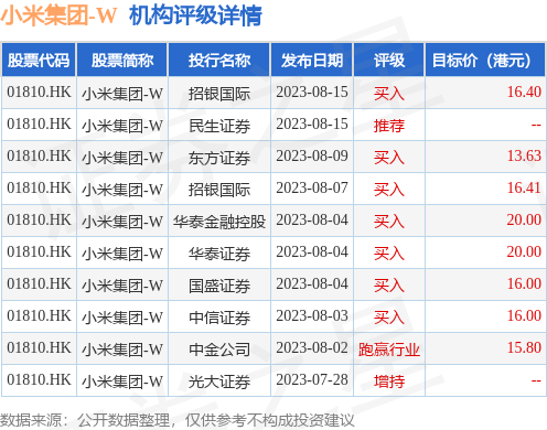 截至2023年8月29日收盘,小米集团-W(01810.HK)报收于12.38港元,上涨1.48%,换手率0.33%,成交量6642.32万股,成交额8.21亿港元。投行对该股的评级以买入为主,近90天内共有7家投行给出买入评级,近90天的目标均价为16.78港元。招银国际最新一份研报给予小米集团-W买入评级,目标价16.4港元。