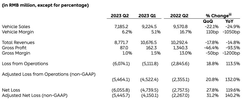 8月29日,蔚来(NIO.US;09866.HK)发布2023年第二季度财报。财报显示,蔚来在第二季度实现营收87.72亿元,同比下滑14.8%,市场预期为91.5亿元;净亏损60.56亿元,同比扩大140.2%。