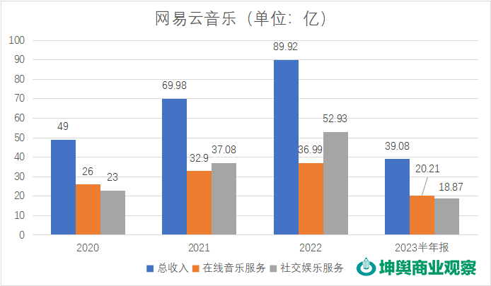 由上述两组数据可以看,网易云音乐从2021年下半年开始发力社交娱乐服务,历时两年,两大业务收入占比在2023年上半年再次转移。