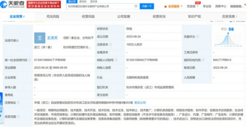 天眼查App显示,近日,杭州阿里巴巴海外互联网产业有限公司成立,法定代表人为王添天,注册资本100万人民币,经营范围含物联网应用服务、软件销售、信息系统集成服务、互联网销售等。股权全景穿透图显示,该公司由杭州阿里巴巴海外数字商业有限公司全资持股,后者为阿里巴巴(中国)网络技术有限公司全资子公司。