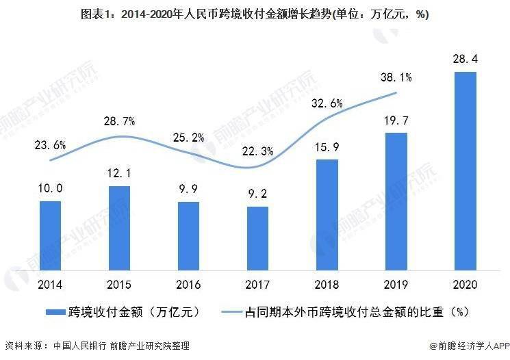 2019年,人民币跨境收付金额占同期本外币跨境收付金额的比重达到了38.1%。而在2020年,人民币跨境收付金额更是高达28.4万亿元。其中,人民币跨境收入占比49.6%,而跨境支出占比50.4%。可以看出,人民币跨境收支相对平衡。