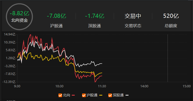 上证报中国证券网讯 截至8月30日午间收盘,北向资金净卖出8.82亿元。其中,沪股通渠道卖出7.08亿元,深股通渠道卖出1.74亿元。