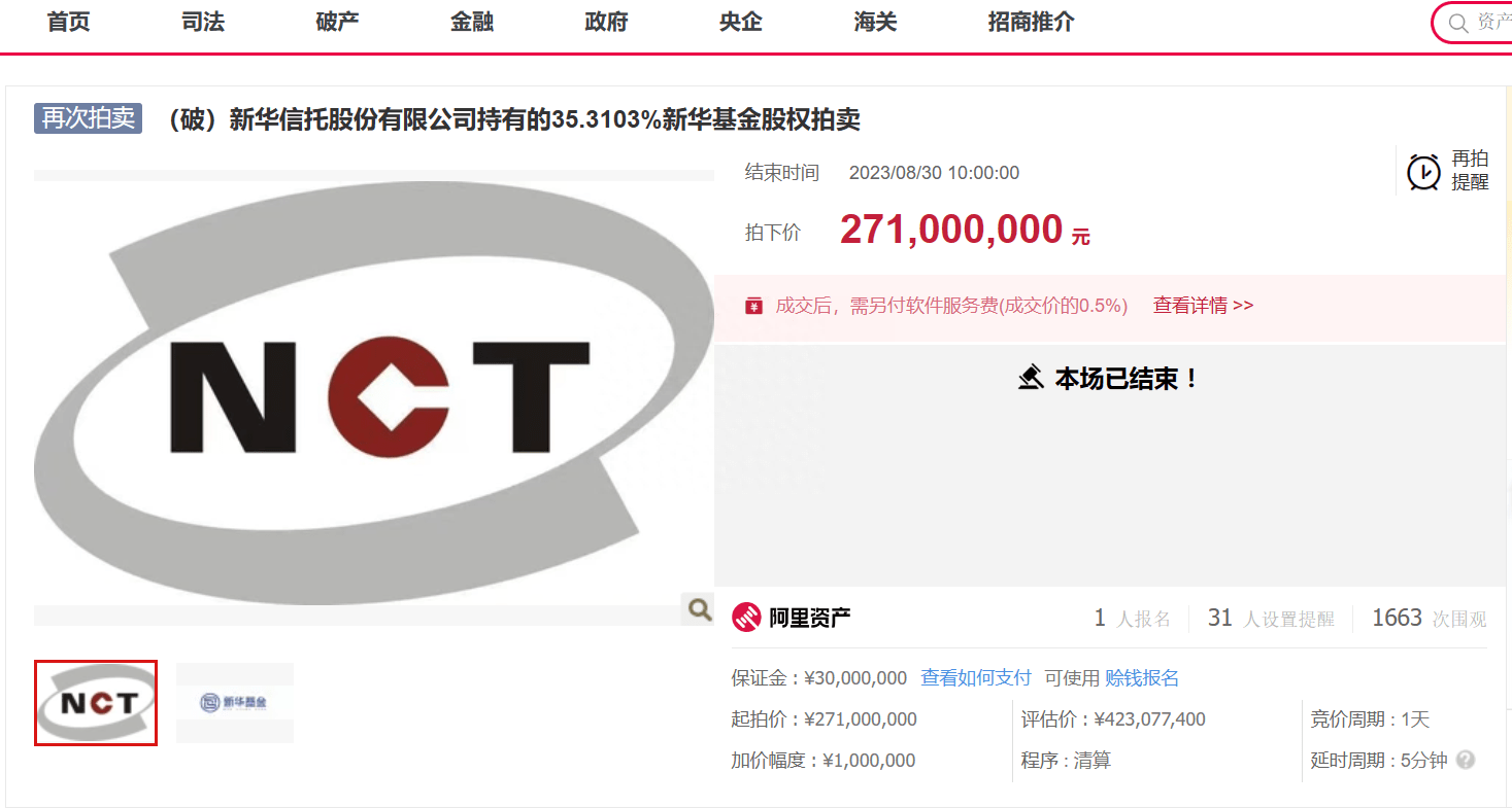 新华信托在阿里资产拍卖平台公开拍卖所持有的新华基金35.31%股权,经过前几轮流拍后,终于尘埃落定。8月30日,拍卖以2.71亿元落槌成交,北京华融综合投资有限公司和重庆市江北区国有资本投资运营管理集团有限公司联合拿下相关股权。