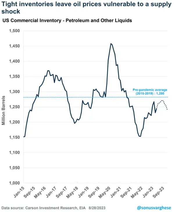 目前美国原油库存低于2015-2019年的平均水平,这可能使汽油市场更容易受到供应冲击,最终推高油价。