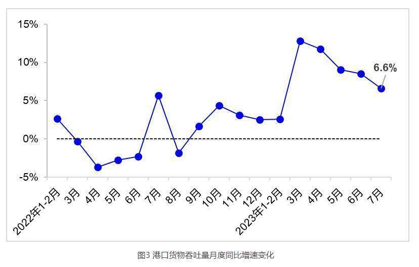 7月,全国港口完成货物吞吐量14.3亿吨,同比增长6.6%,其中内、外贸吞吐量分别增长5.8%和8.5%。完成集装箱吞吐量2705万标箱,同比增长2.6%。