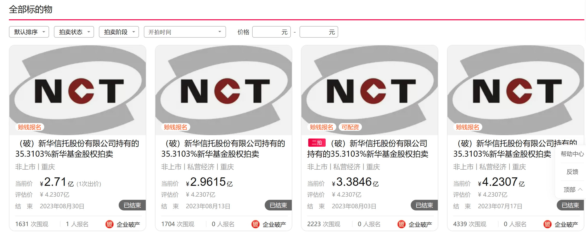 在此次成功拍卖前,新华基金这部分股权已经经历了三次流拍。