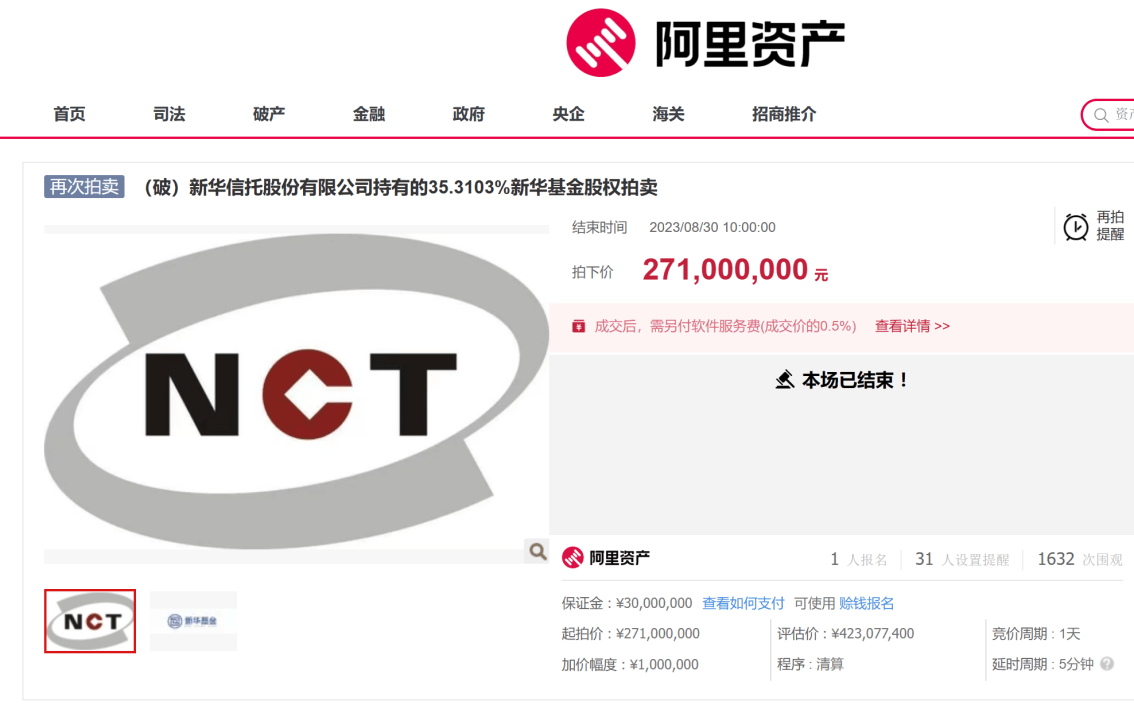 根据阿里资产平台公布的信息,从7月中旬到8月中旬,新华基金35.3103%的股份共进行了三次竞拍,评估价也从最初的4.2307亿元逐次降低至2.9615亿元,相当于打了7折,但仍然无人出价。