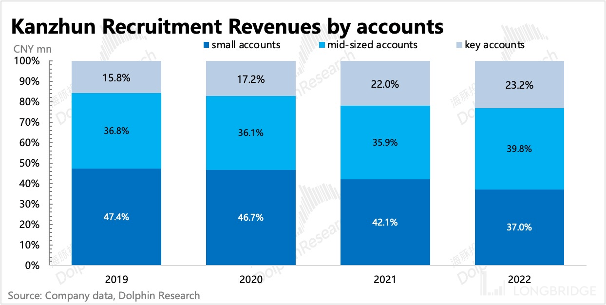 但对于 BOSS 直聘来说,虽然中小企业的收入贡献在逐年提升,但 2022 年占比仍有 1/3 的 KA 企业客户,他们的需求回暖节奏仍然对收入或者是现金流水有很大影响。