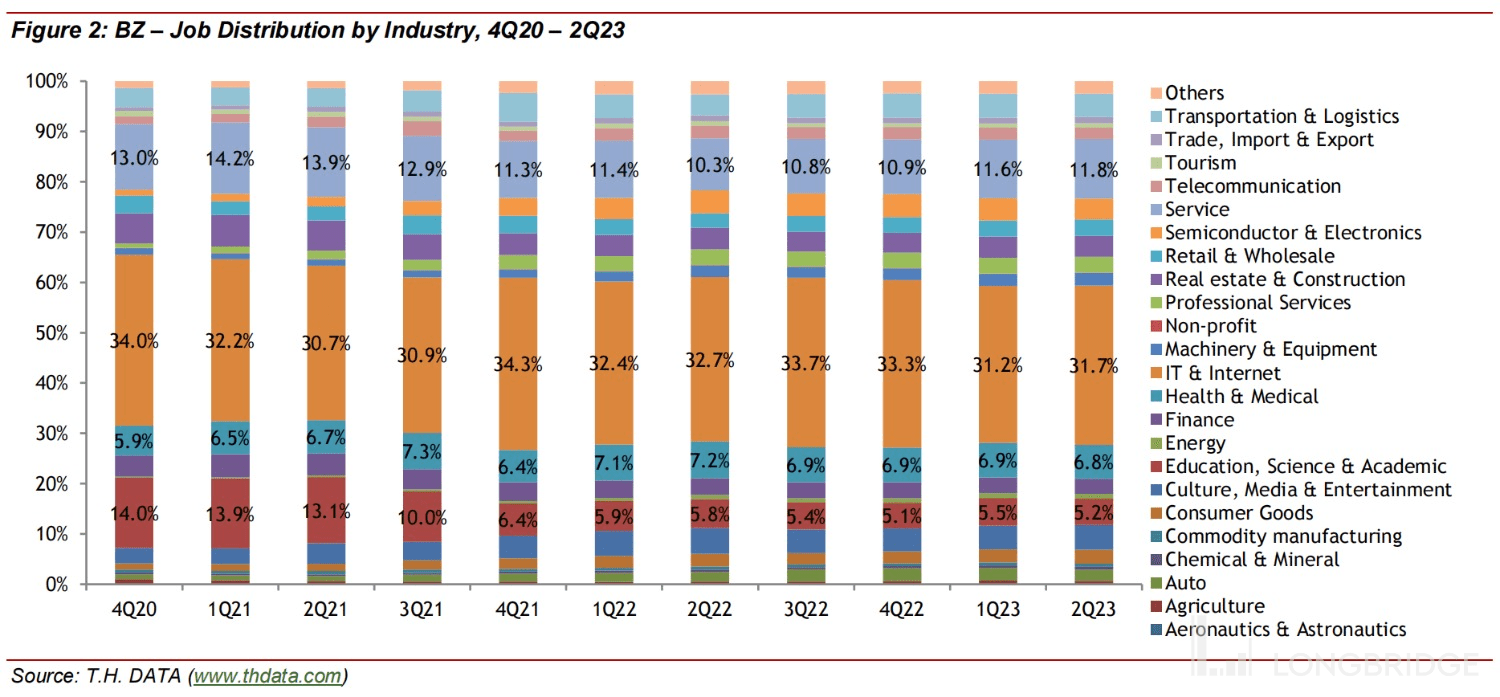从另类数据来看,二季度招聘职位发布数同比、环比也大幅增长,值得一提的是,互联网 IT 等企业的发布需求开始环比回暖。