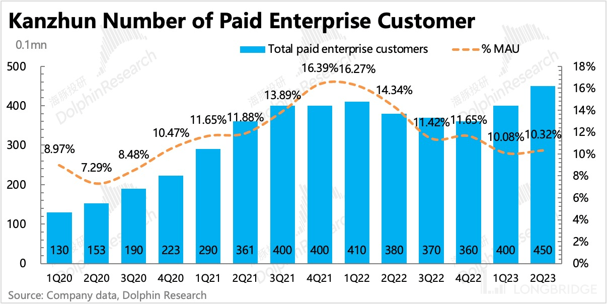 二季度虽然企业付费账户达到 450 万,环比增加 50 万,上半年合计增加了 90 万的企业账户,如果按照往年平均一个企业对应 2 个账户的话(中小企业增多后,该数值会继续低于 2),意味着 BOSS 直聘至少新增了 45 万家企业的付费。