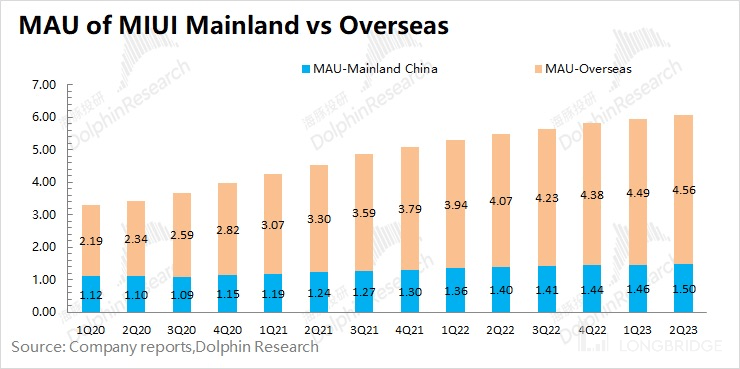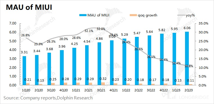 MIUI 用户数:截止到 2023 年 6 月,MIUI 月活跃用户数达到 6.06 亿,同比增长 11%,本季度 MIUI 用户增速继续回落,但用户数仍维持着两位数的扩张速度。