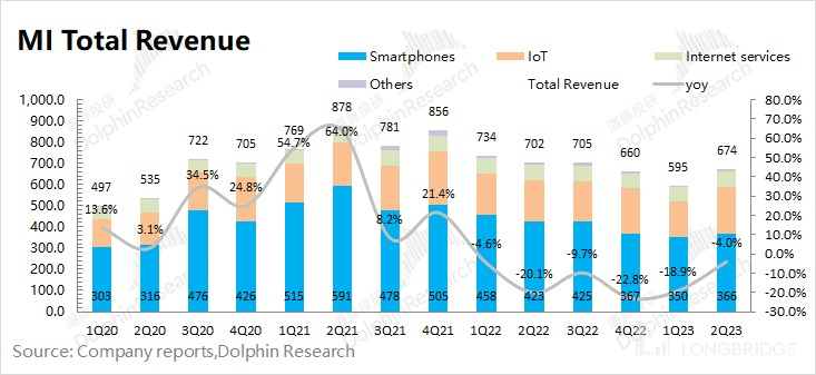 其中海外互联网收入,小米本季度仍实现了 19.7% 的增长。而公司本季度海外收入的两位数下滑,主要来自于硬件业务。在本季度全球宏观不稳定因素的环境下,直接影响了小米的手机和 IoT 产品的出口。根据海豚君的测算,小米手机本季度在海外市场(除中国以外)出货量同比下滑达到 15.2%,与海外市场收入下滑情况相近。进一步可以推测出本季度的海外 IoT 业务,也有两位数下滑。