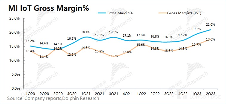 本季度 IoT 业务的毛利率 17.6%,同比上升 3.3pct。这是由于部分零部件的价格下降以及 IoT 中部分高毛利的产品销售增加所致。