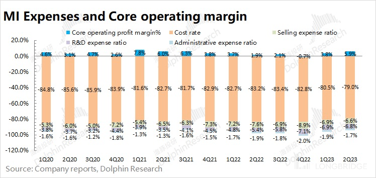 2023 年第二季度小米三项费用合计 101.7 亿元,同比下滑 2.3%。公司本季度费用端的下滑,主要是对销售费用和管理费用进行了控制。