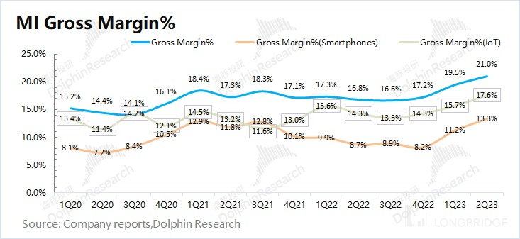 小米集团 2023 年第二季度毛利率 21%,同比上升 4.2pct,超市场预期(19.9%)。