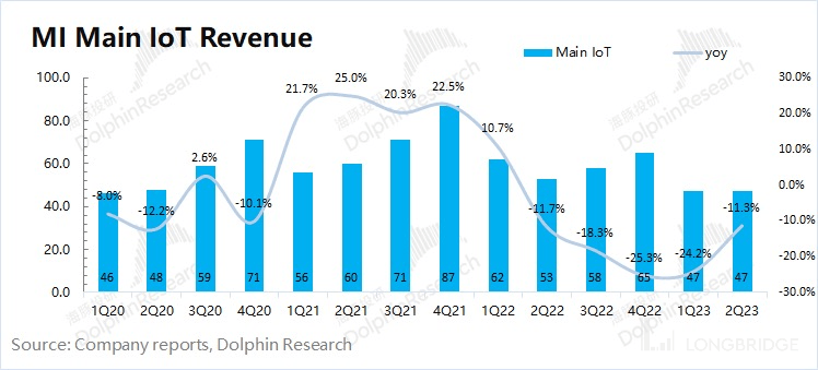 2023 年第二季度小米 IoT 业务实现营收 223 亿元,同比增长 12.3%,超市场预期(207 亿元)。IoT 业务本季度的增长,主要是智能大家电的高增长带来。