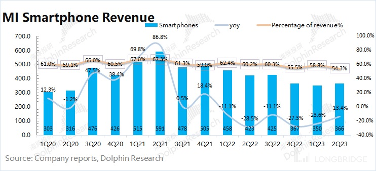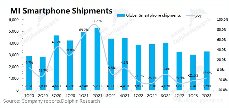 量:2023 年第二季度小米智能手机出货量 3290 万台,同比下滑 15.9%。