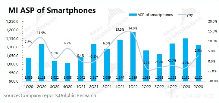 价:2023 年第二季度小米智能手机出货均价 1112 元,同比上升 2.9%。