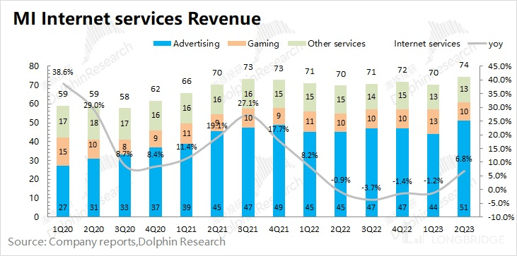 2023 年第二季度小米互联网服务业务实现营收 74 亿元,同比增长 6.8%,在公司总营收占比 11.1%,符合市场预期(73 亿左右)。