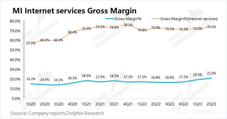 2023 年第二季度小米互联网服务业务毛利 55.2 亿元,同比增长 8.4%。本季度互联网毛利率同比上升 1.5pct,主要由于本季度公司的游戏等业务有所回暖。