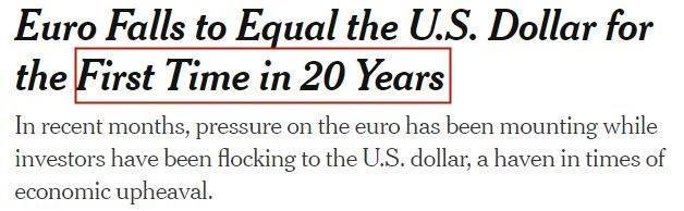 欧元下跌趋势随之加剧,甚至一度创下20年来首次跌至与美元平价的纪录。