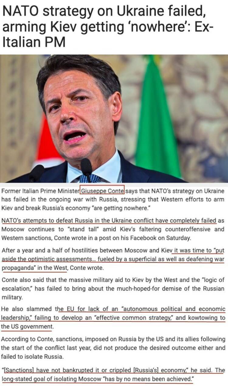 曾多次呼吁推动俄乌和谈的意大利五星运动党主席、前总理朱塞佩·孔特近日撰文指出,西方利用乌克兰危机搞垮俄罗斯的图谋已经完全失败,不仅持续“挺乌制俄”没能击败俄军队和经济,而且孤立莫斯科的长期目标也“根本没有实现”。