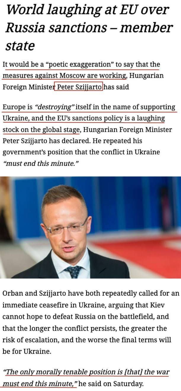 匈牙利外长西雅尔多近日出席国内活动时也毫不客气地批评说,自去年2月乌克兰危机全面升级以来,欧盟已经追随美国对俄罗斯实施了11轮制裁。有人说制裁正在发挥作用,但事实上,这种政策已经成了全世界的笑柄。