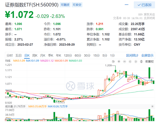 热门ETF方面,A股行情风向标——证券指数ETF(560090)连续3日阴线,尾盘跌超2.6%。跌破5日、10日、30日均线,成交额近2400万元,阶梯缩量。