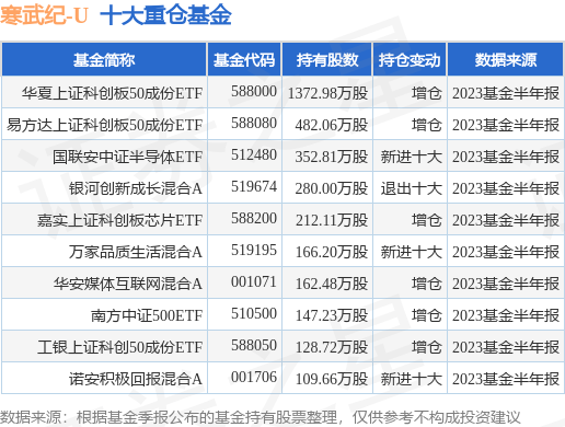 根据2023基金半年报公募基金重仓股数据,重仓该股的公募基金共272家,其中持有数量最多的公募基金为华夏上证科创板50成份ETF。华夏上证科创板50成份ETF目前规模为671.92亿元,最新净值0.9596(8月29日),较上一交易日上涨4.08%,近一年下跌17.46%。该公募基金现任基金经理为张弘弢 荣膺。张弘弢在任的基金产品包括:华夏沪深300ETF联接A,管理时间为2009年7月10日至今,期间收益率为35.03%;华夏沪深300ETF,管理时间为2012年12月25日至今,期间收益率为90.53%;华夏网购精选混合A,管理时间为2016年11月2日至今,期间收益率为27.4%;华夏上证50ETF,管理时间为2016年11月18日至今,期间收益率为23.06%。荣膺在任的基金产品包括:华夏中证500ETF联接A,管理时间为2016年10月20日至今,期间收益率为-2.75%;华夏中证500ETF,管理时间为2016年10月20日至今,期间收益率为-2.76%;华夏中证央企ETF,管理时间为2018年10月19日至今,期间收益率为28.53%;华夏创业板价值ETF,管理时间为2019年6月14日至今,期间收益率为36.08%。
