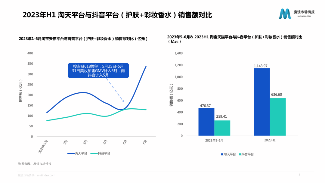 报告显示,与往年类似,上半年美妆销售的爆发期在今年618期间如期来临。其中5月和6月的加总销售数据,淘宝天猫平台的总销售额为470.37亿元,抖音销售额为259.41亿元。此前,曾有市场消息传出,称抖音在5月美妆销售超越淘宝。对此,魔镜分析指出,由于各家平台的销售周期不同,销售波峰略有不同,其中淘宝5月份是预售期,GMV计入6月,一增一减,才产生了抖音超过淘系的消息。