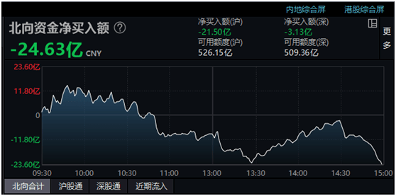 北向资金今天再次呈现净卖出,全天净卖出额为24.63亿元。