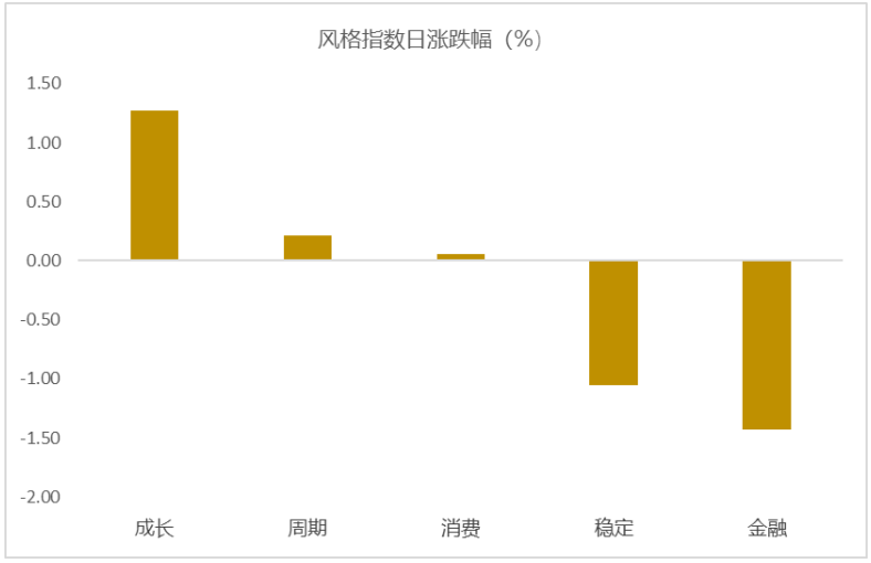 从风格指数上来看,今日多数风格均表现不错,其中成长和周期风格的个股涨幅最大,金融风格的个股表现最弱。近期风格转换较为明显。