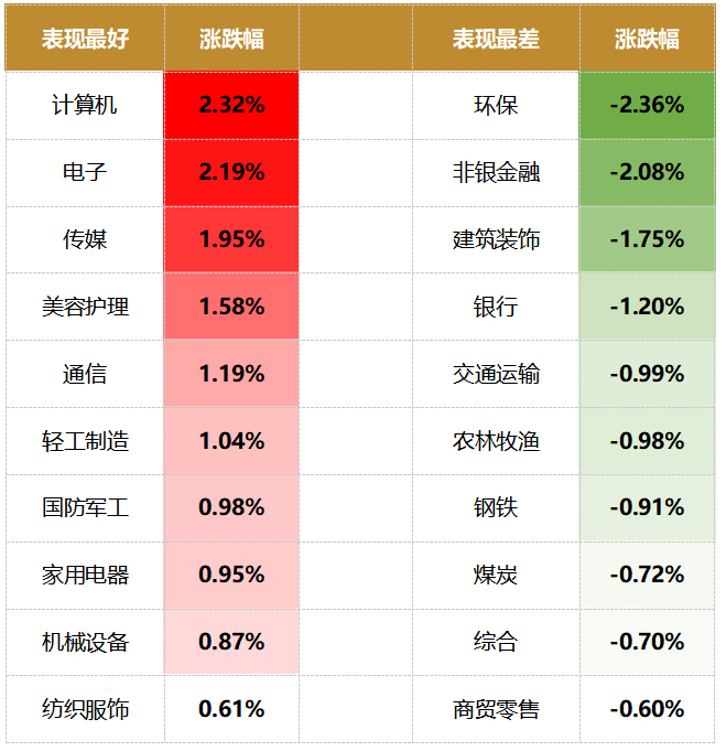 盘面上,31个申万一级行业中有14个行业上涨,其中计算机,电子,传媒行业领涨,涨幅分别为2.32%,2.19%,1.95%。环保,非银金融,建筑装饰行业领跌,跌幅分别为2.36%,2.08%,1.75%。