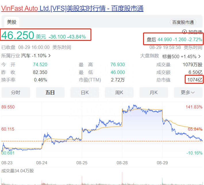 自上市以来,VinFast Auto股价一路攀升,甚至用起飞来形容都毫不为过,直至8月25日成为仅次于特斯拉和丰田的全球第三大厂商。可惜好景不长,当地时间8月29日,公司股价暴跌43.84%,报收46.25美元,总市值1074亿美元,一夜蒸发838亿美元,且盘后还在小跌。