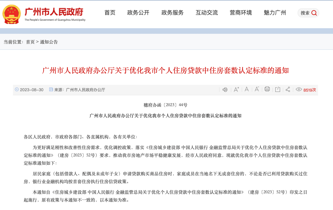 8月30日,广州市人民政府发布《关于优化我市个人住房贷款中住房套数认定标准的通知》(下称《通知》),《通知》指出为更好满足刚性和改善性住房需求,优化调控政策,落实《住房城乡建设部 中国人民银行 金融监管总局关于优化个人住房贷款中住房套数认定标准的通知》(建房〔2023〕52号)要求,推动全市房地产市场平稳健康发展,广州市现就优化个人住房贷款中住房套数认定标准通知如下: