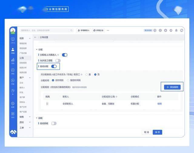 据了解,尘锋SCRM本次上线的公海自动分配功能,可以实现公海与公海、公海与员工私库之间的自动分配流转,既可以实现按规则自动分配,将符合条件的线索从A公海自动转移到B公海,全面高效地将同类线索自动集中到一个公海中,还可以基于企业对员工接待的规则设置,将线索自动分配给员工,同时可限制公海每日自动分配给员工私库的线索数量。