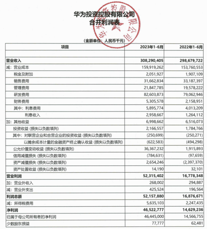 原标题:华为半年报:上半年实现营收3082.90亿,净利润为465.23亿