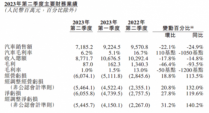 日前,蔚来汽车公布了截至2023年6月30日的第二季度未经审计的财务业绩。根据数据显示,蔚来汽车2023年第二季度营收87.717亿元同比下降14.8%,毛利润8700万元同比下降93.5%,净亏损60.558亿元同比增长119.6%,调整后净亏损54.457亿元同比增长140.2%;二季度汽车交付量为23520辆。