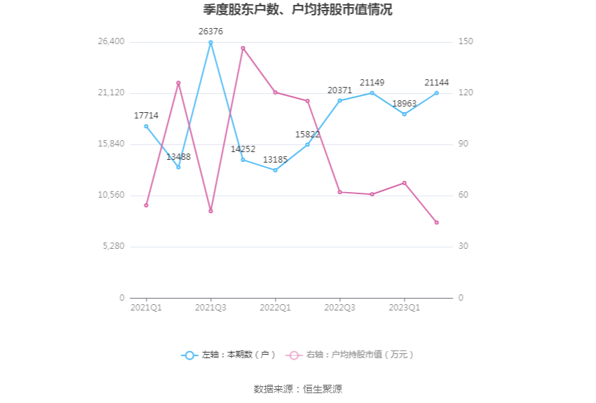 筹码集中度方面,截至2023年二季度末,公司股东总户数为2.11万户,较一季度末增长了2181户,增幅11.50%;户均持股市值由一季度末的67.48万元下降至44.29万元,降幅为34.37%。
